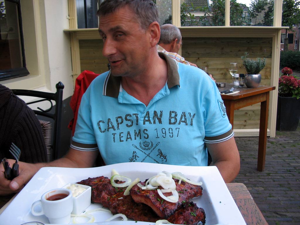 Einmal rechts rum und zwei Brücken weiter sind wir im Passantenhafen von Leiden. Ein schöner Hafen direkt in der Stadt. Dadurch ist es hier wirklich windstill. Auch die sanitären Anlagen sind gut, wenn man sie denn erst mal gefunden hat. Von Außen zumindest mag man das kaum glauben. Der Ort hat eine sehr lange Einkaufsstraße. Normalerweise werden dort um 17:30 immer die Bürgersteige hoch geklappt, aber heute ist langer Donnerstag. Da sind wir in Deutschland schon weiter. Am Ende der Einkaufsstraße kommen wir an ein anderes Hafenbecken. Man kann Leiden theoretisch auch von Westen her anfahren. Rund um das Hafenbecken befindet sich die Fressmeile. Hier finden wir einen leckeren Griechen. Bei Grillteller, Rotwein und Sonnenschein lassen wir den Tag ausklingen.