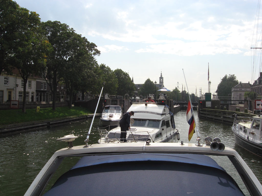 Wir verlassen die Vecht durch die Zeesluis in Muiden und folgen einem Segler aufs Markermeer hinaus. Man sieht bei mir die geklappten Antennen, damit wir unter den Brücken hindurch kommen.