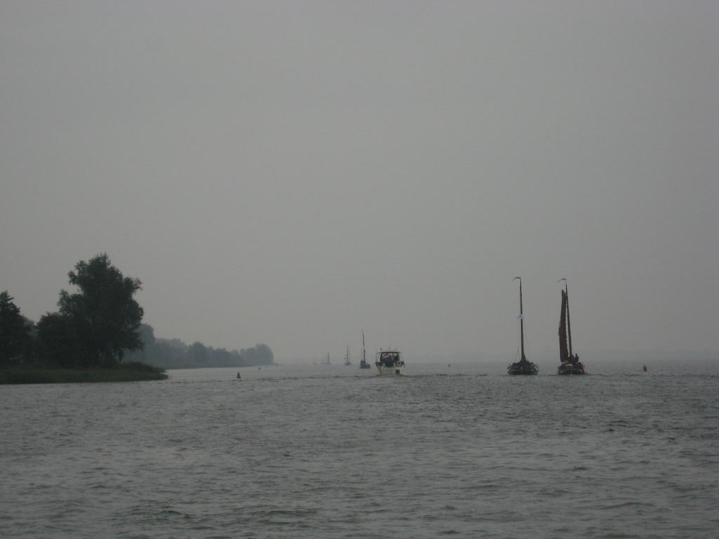 12.09.2008 Dank der nahen City war das Brötchenholen wieder ein Kinderspiel. Später geht es auf die letzte Etappe zurück nach De Klink. Doch eine Überraschung hat das Wetter noch für uns. In der Nijkerkersluis macht der Himmel seine Schleusen auf. Es schüttet wie aus Kübeln. Die Frauen werden, beim Festhalten der Boote in der Schleuse, richtig nass. Kleiderwechsel ist angesagt. Da sitze ich als Kapitain doch besser trocken unter dem Verdeck. Während der Weiterfahrt kann ich aber kaum noch etwas sehen. Geradeso eben ist die nächste Tonne zu orten. Ich fahre möglichst rechts, damit nicht plötzlich ein dicker Pott vor uns aufkreuzt.